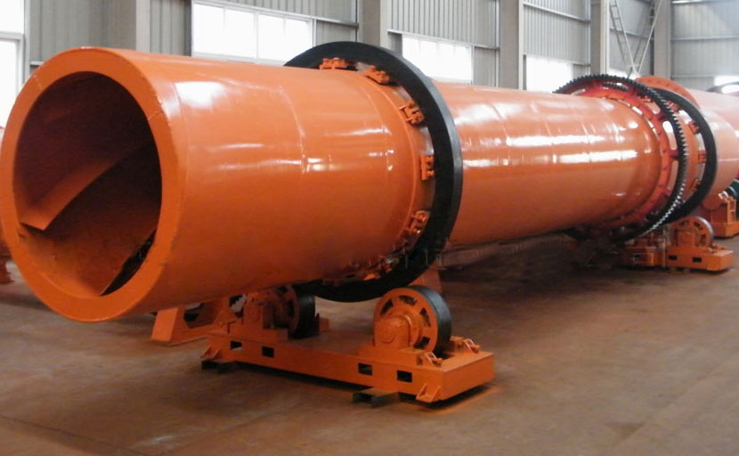 烘干機的熱源來自燃燒裝置,本烘干機采用順流式加熱方式。因此需要烘干的物料,從進料箱、進料溜進入筒體,即被螺旋抄板推向后。由于烘干機傾斜放置,物料一方面在重力和回轉作用下流向后端,另一方面物料被抄板反復抄起,帶至上端再不斷地揚撒下來,使物料在筒內形成均勻的幕簾,充分與筒內的熱氣流進行熱交換,由于物料反復揚撒,所含的水分逐漸被烘干,從而達到烘干的目的。